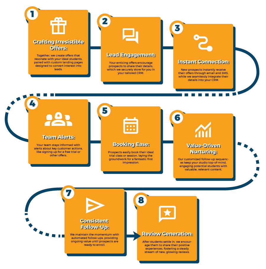 Rapid Rollout: Get set for growth fast with our 14-day launch turnaround. We're dedicated to swiftly setting up your studio's growth system, helping you welcome new students through your doors as soon as possible